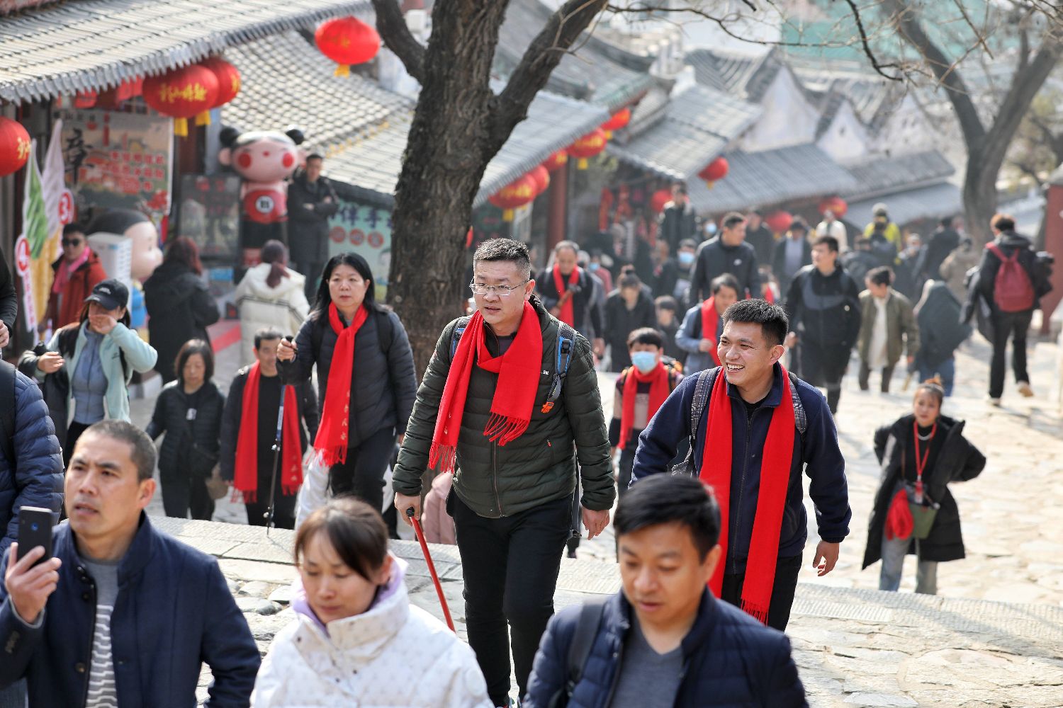 11日,“龙腾泰山 国泰民安”二月二龙抬头泰山民俗文化节登泰山活动在山东泰安岱庙文化广场启动。活动邀请来自中国各地生肖属龙的游客代表和广大登山运动爱好者,共同参加登泰山活动。图为游客参加登泰山活动。