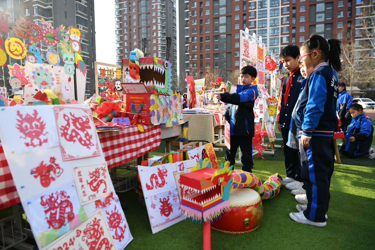 11日,河北省石家庄市桥西实验小学举办“二月二龙抬头”校园庙会活动。图为学生们逛“庙会”。