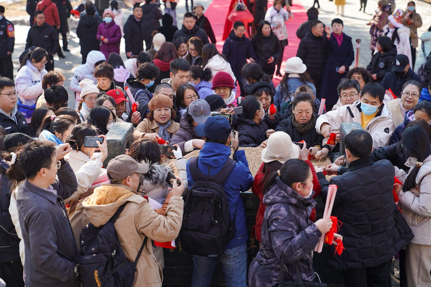 11日,民众在哈尔滨文庙的“和谐鼎盛”鼎处抓取“吉祥五谷”。当日,哈尔滨文庙举行系列民俗活动,不少民众前往参与。