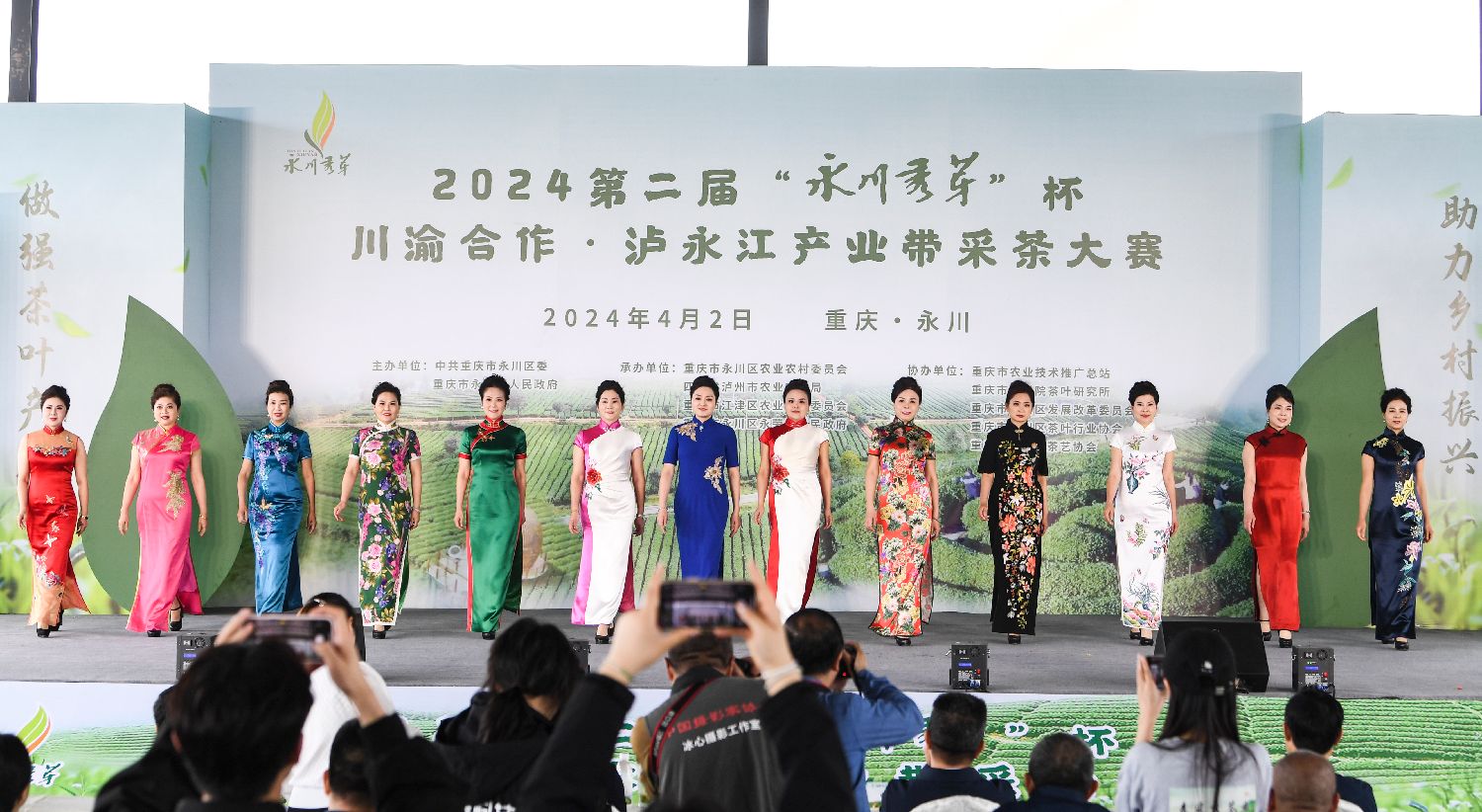 2日,演员在2024第二届“永川秀芽杯”川渝合作泸永江产业带采茶大赛开幕式上进行旗袍展示。