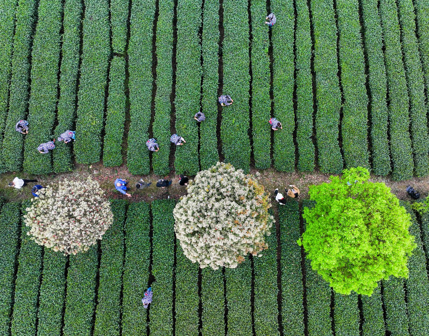 2日,选手在重庆市永川区永荣镇白云寺村乡村振兴就业园茶叶采摘区采茶(无人机照片)。