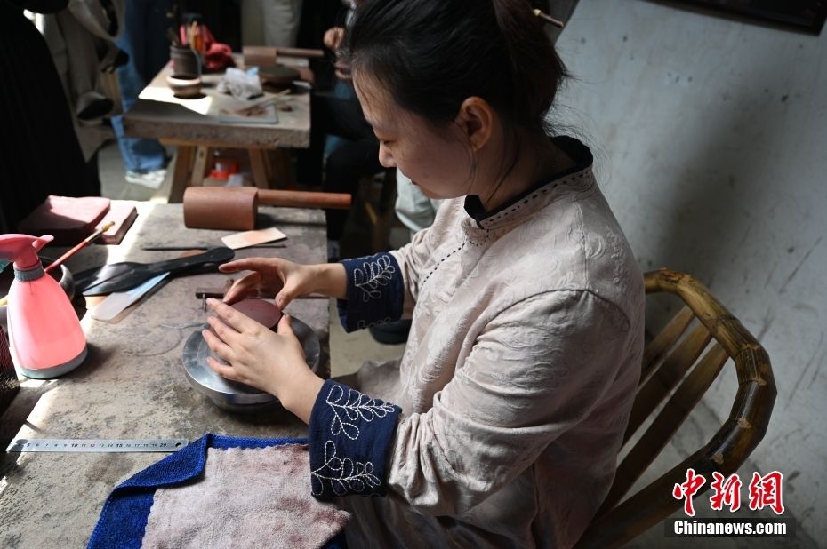 崇仁古镇员外台门内,工艺美术师正在制作紫砂壶。