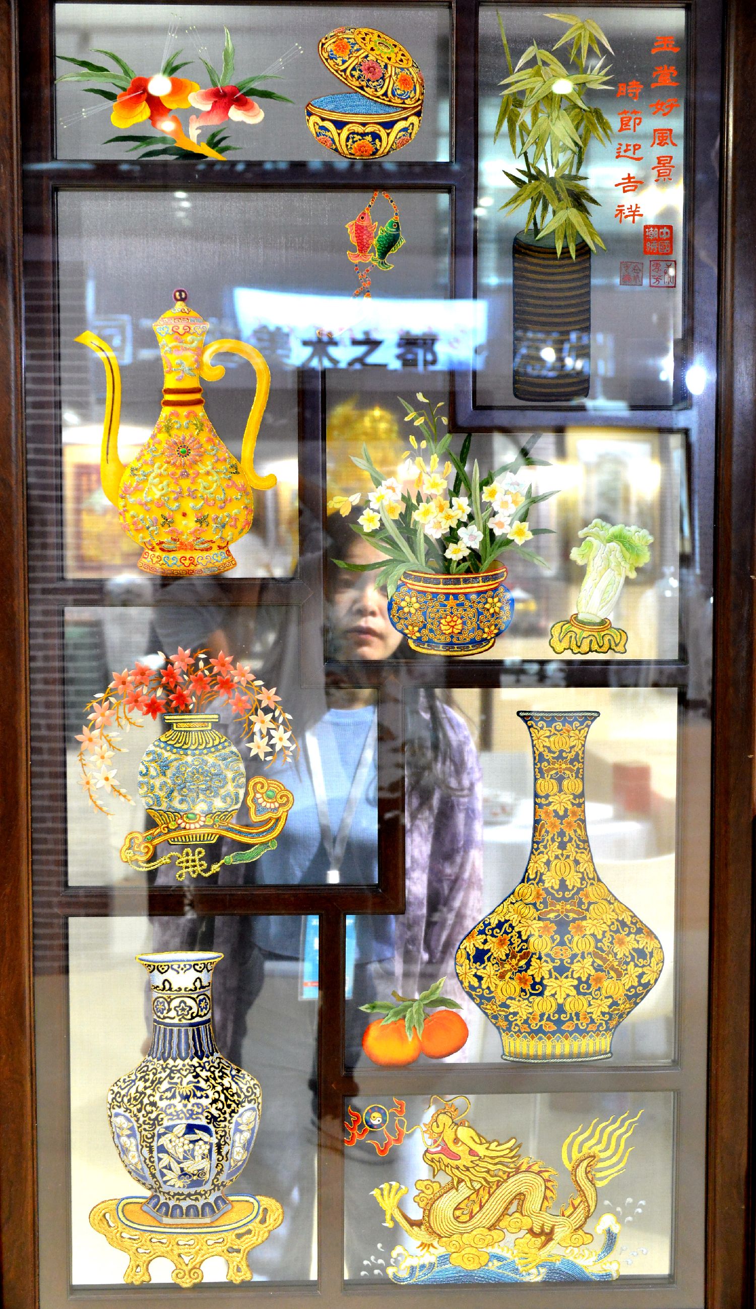 图为双面潮绣《玉堂呈吉祥》屏风吸引参观者。