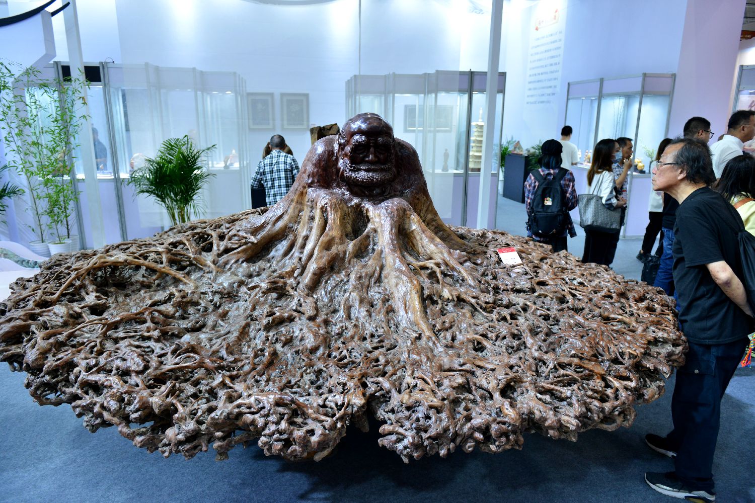 图为福州木雕作品《蒲团达摩》吸引参观者。