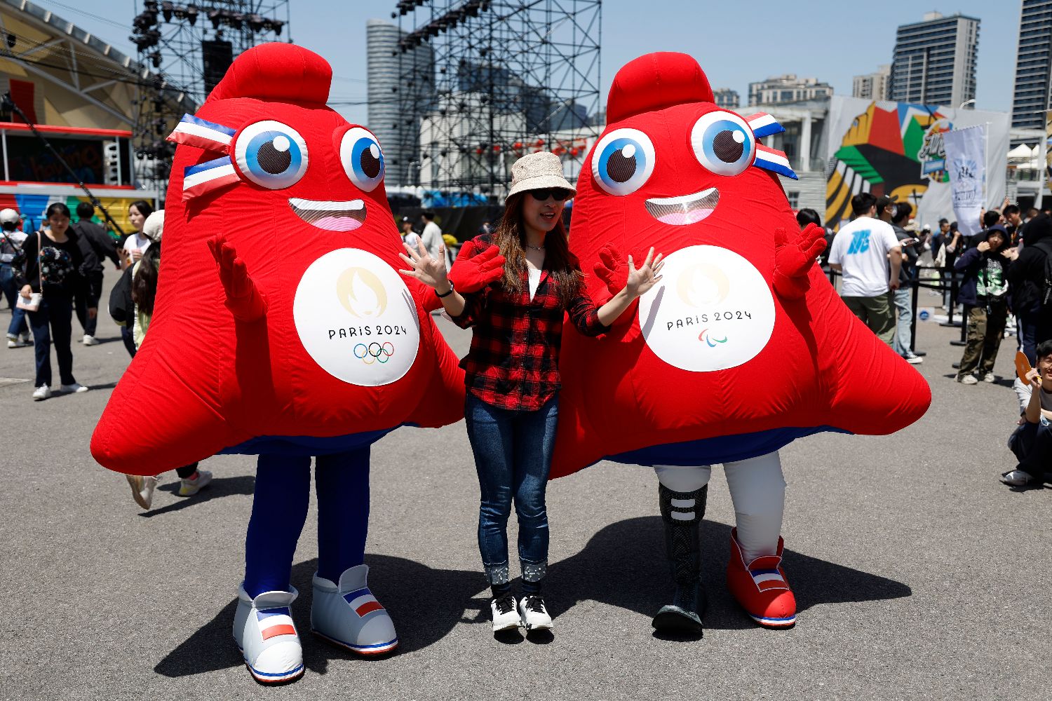 观众与巴黎奥运会、残奥会吉祥物弗里热合影。