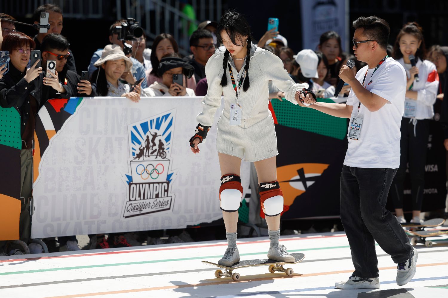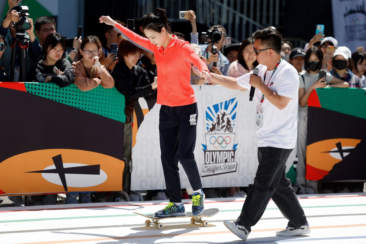 在这项国际奥委会全新打造的赛事中,四个奥运新兴项目——滑板、攀岩、霹雳舞、自由式小轮车的464名世界顶尖选手,将为150余张巴黎奥运会入场券展开终极对决。比赛将持续至19日。图为吴敏霞体验滑板项目。