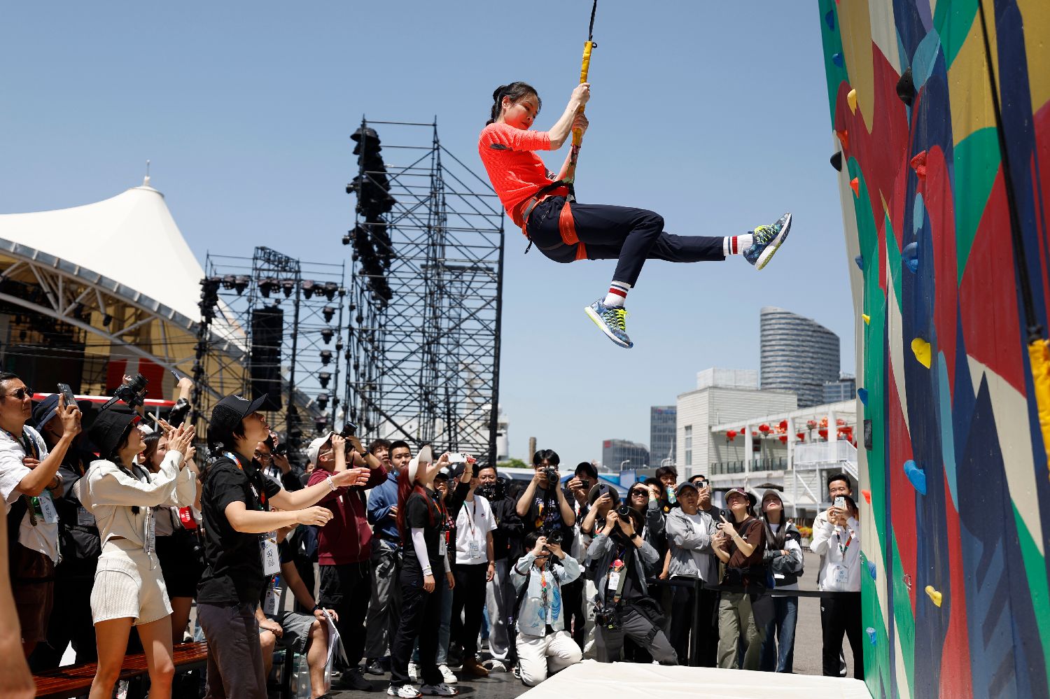范志毅、吴敏霞、钟天使、赵丽娜、黄龄等上海文体明星化身“运动体验官”,感受滑板、攀岩等奥运项目的魅力。图为吴敏霞体验攀岩项目。
