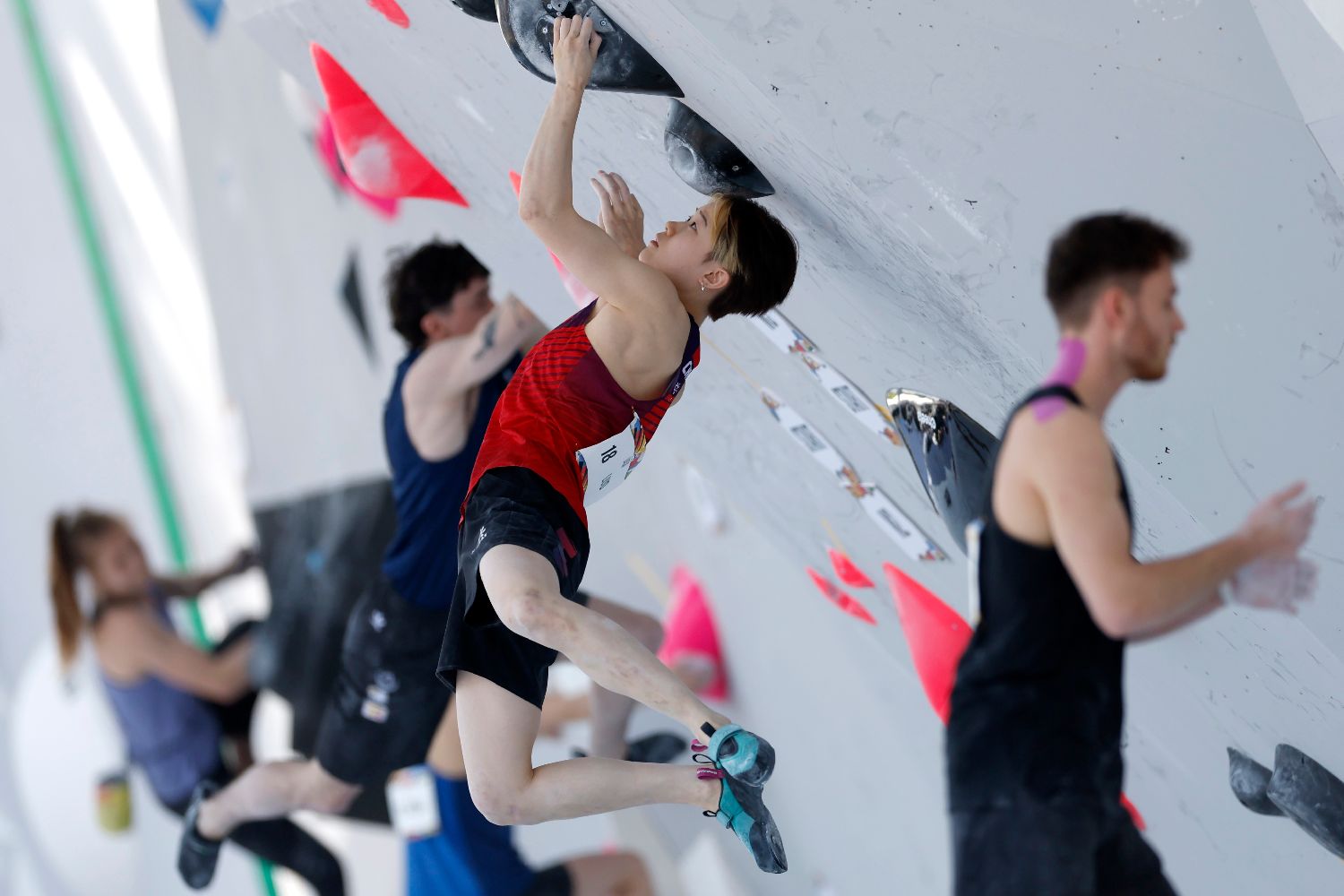 中国选手骆知鹭(右二)亮相奥运会资格系列赛上海站女子攀岩全能预赛——攀石项目。