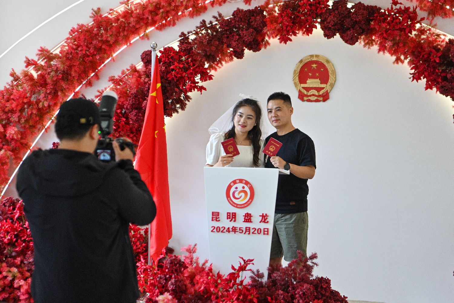 云南昆明首个公园式婚姻登记点在盘龙区茨坝街道871东区正式启用。茨坝街道按照婚姻登记机关标准进行规划布局,将公园景观与幸福美好的婚姻登记完美融合,把871东区婚姻登记处打造为公园式婚姻登记处,让“一纸婚约”融入昆明的城市文化。图为一对新人20日领取结婚证后拍照留念。