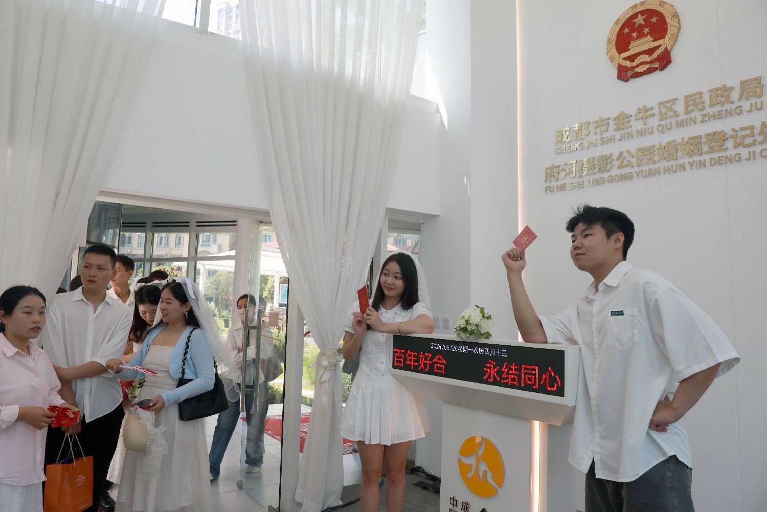 四川成都的一对新人20日在高新区桂溪生态公园婚姻登记处领取结婚证后拍照留念。