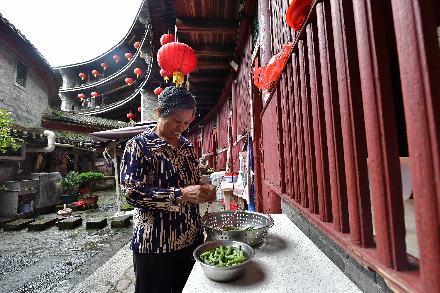 居住在“福建土楼”永定景区振成楼内的村民22日在摘菜。如今,仍然有许多居民居住在土楼内,让参观的游客有机会了解土楼人家生活。