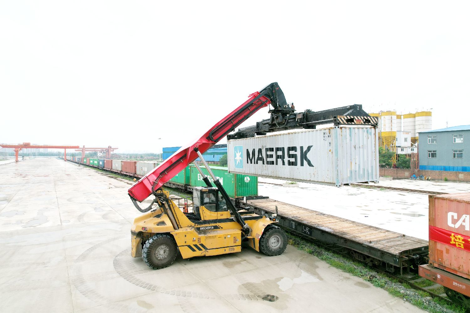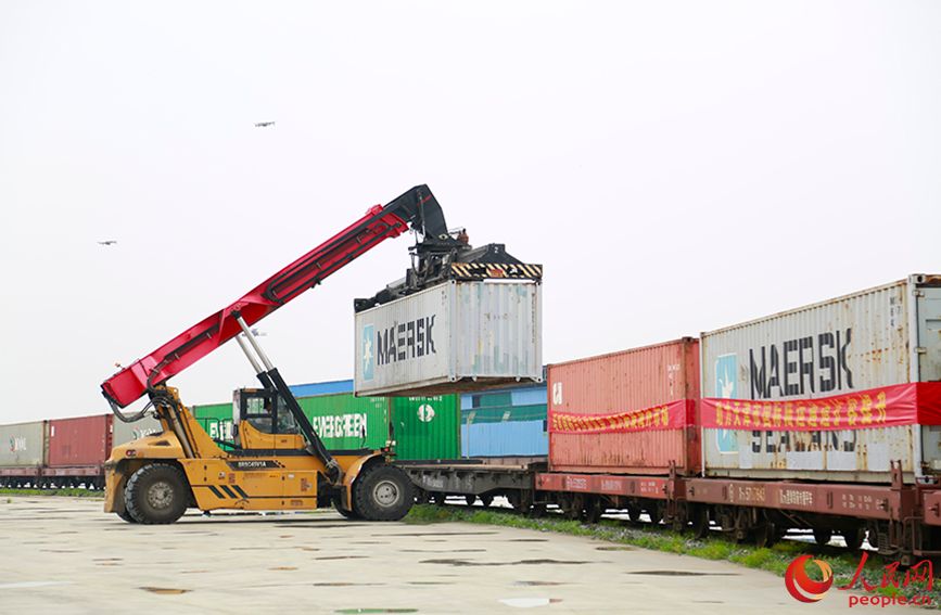 货运列车进行集装箱吊装作业。(图片来源:北京人民网)