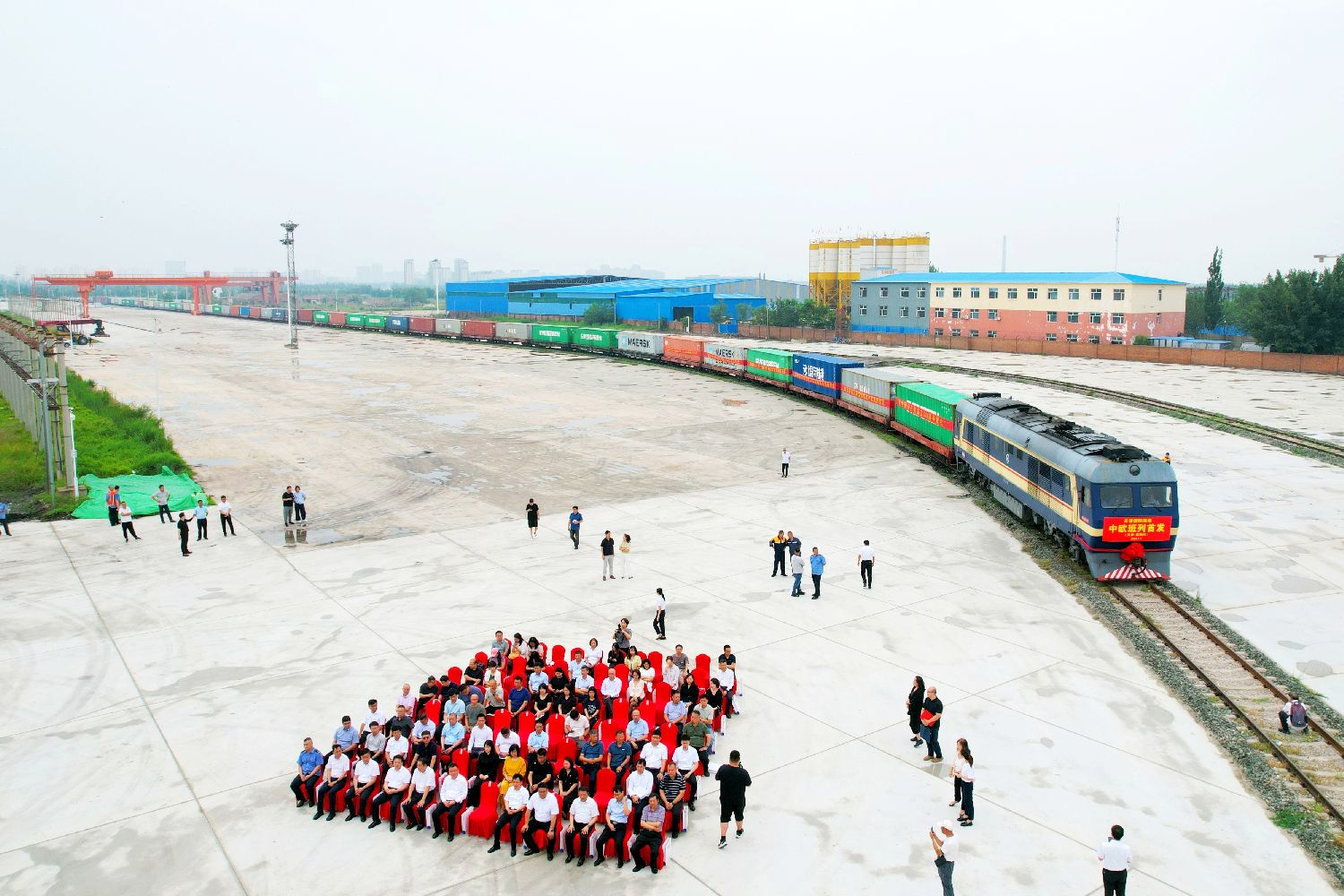 在位于天津市西青区的天津国际陆港举办的发车仪式。(无人机照片)(图片来源:中新社)