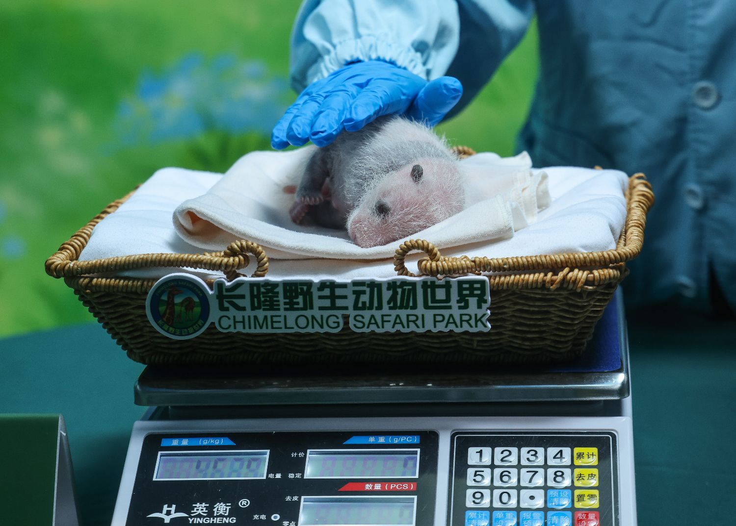工作人员2日为广州长隆大熊猫三胞胎“萌萌”产下的幼仔称重。(图片来源:新华社)