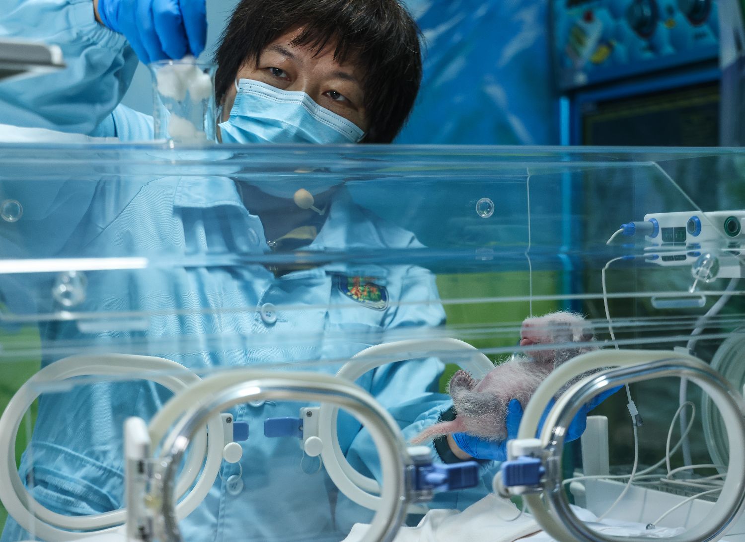保育人员2日帮助新生大熊猫幼崽排便。(图片来源:中新社)