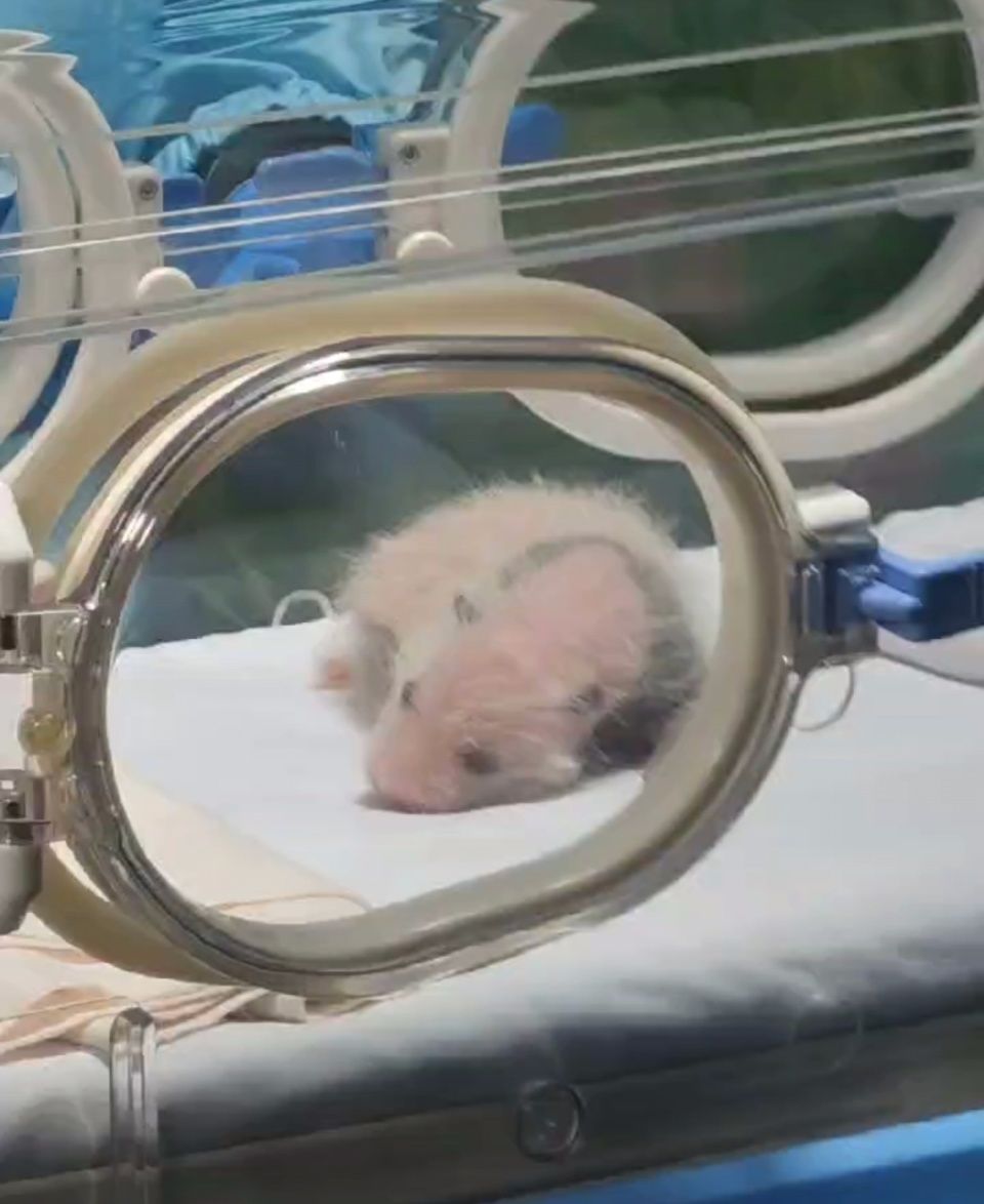 小仔出生后叫声嘹亮、外观正常,健康状况良好。图为新生大熊猫幼崽亮相。(图片来源:广东《广州日报》)