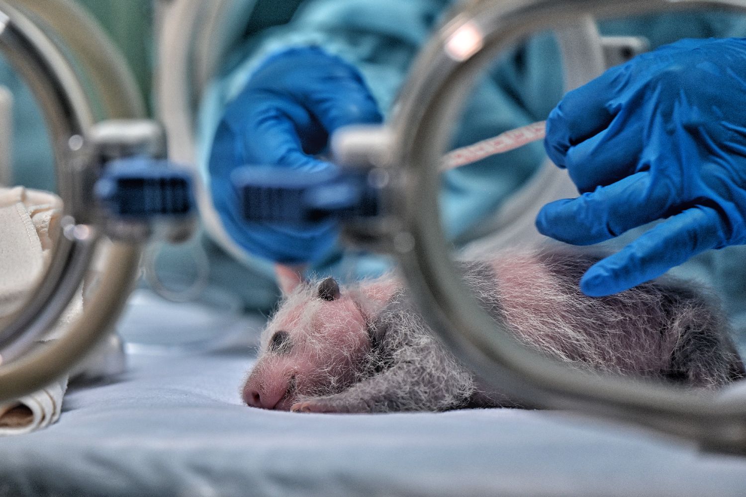 工作人员2日为广州长隆大熊猫三胞胎“萌萌”产下的幼仔测量胸径体长。(图片来源:新华社)