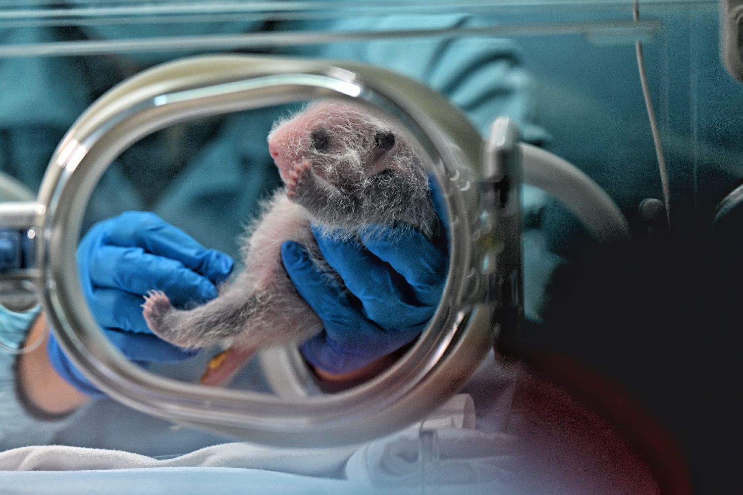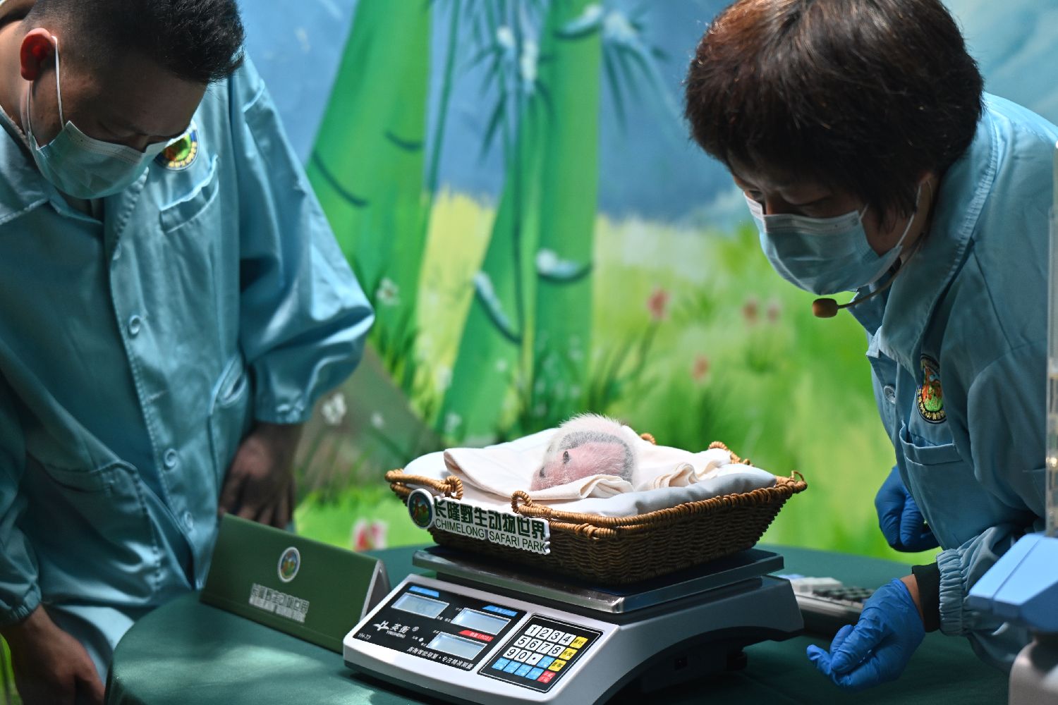 保育人员2日为新生大熊猫幼崽测量体重。(图片来源:中新社)