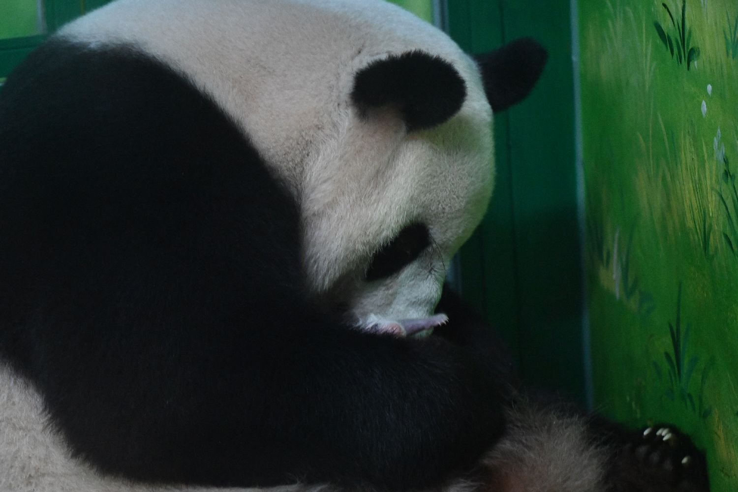 截至7月1日,熊猫宝宝体重已达423.5克,较出生时增重245.5克。图为大熊猫“萌萌”时常舔舐宝宝。(图片来源:广东《广州日报》)