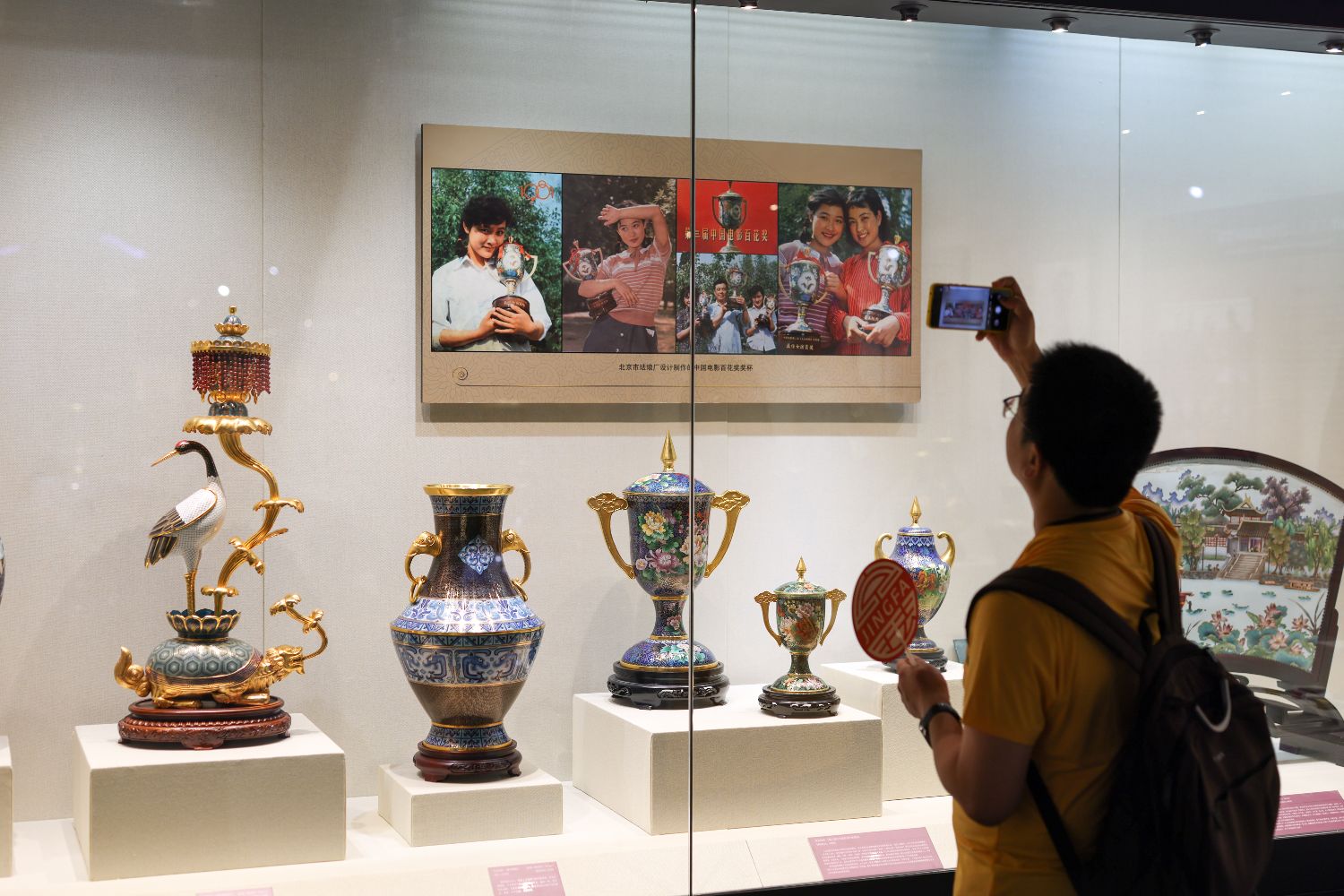 参观者拍摄景泰蓝制作的奖杯。(图片来源:中新社)