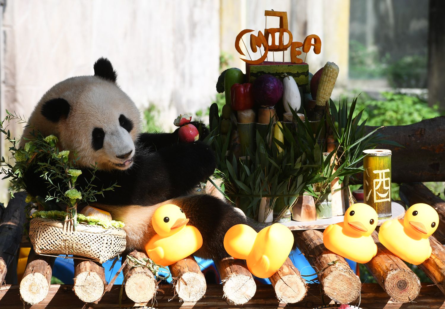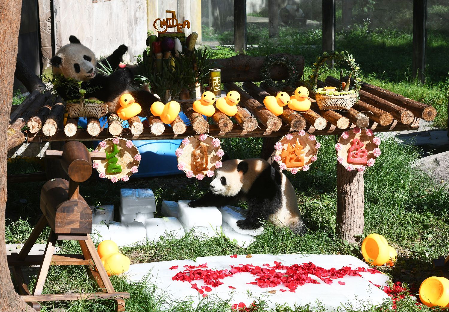 重庆动物园22日为大熊猫举办生日会,庆祝“渝可”“渝爱”两周岁生日。(图片来源:中新社)