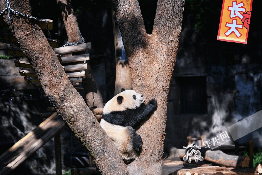 熊猫宝宝爬树萌翻游客。(图片来源:重庆华龙网)