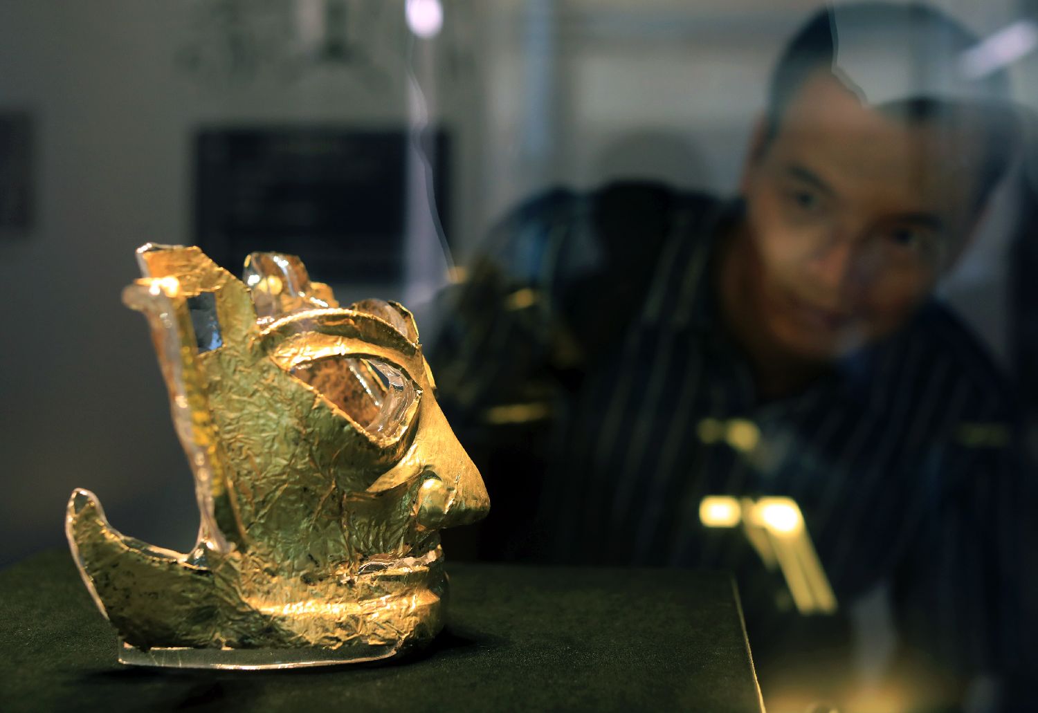 参观者22日在“匠心妙手——三星堆遗址新出土文物保护修复成果展示”试开放期观看展出的金面具。(图片来源:中新社)