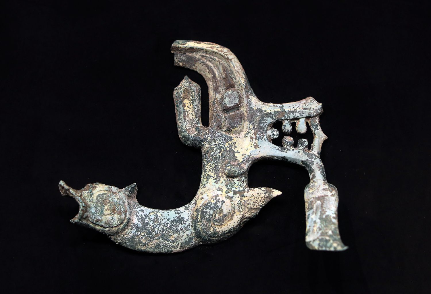 22日拍摄的“匠心妙手——三星堆遗址新出土文物保护修复成果展示”展出的青铜树枝。(图片来源:中新社)