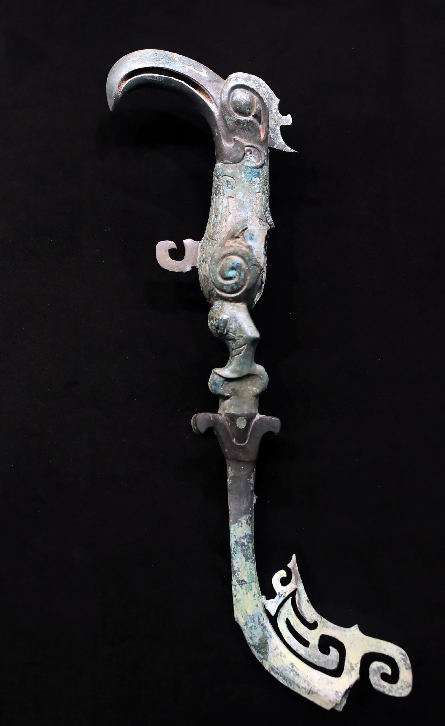 22日拍摄的“匠心妙手——三星堆遗址新出土文物保护修复成果展示”展出的青铜龙首。(图片来源:中新社)