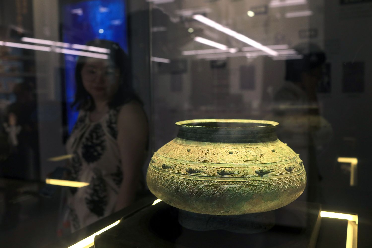 参观者22日在“匠心妙手——三星堆遗址新出土文物保护修复成果展示”试开放期观看展出的青铜瓿。(图片来源:中新社)