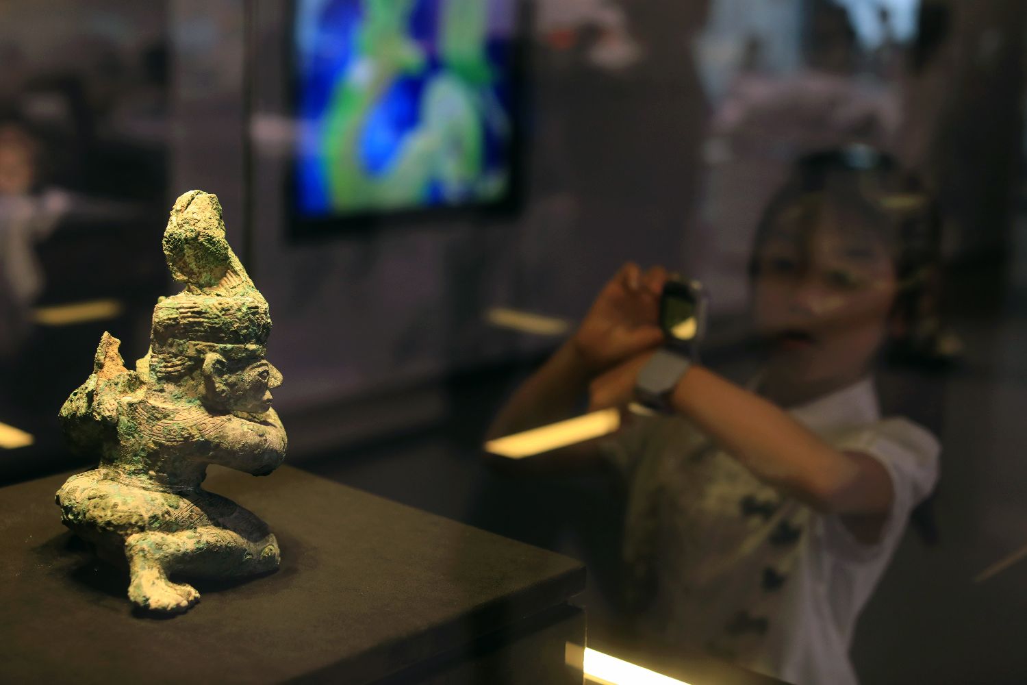 参观者22日在“匠心妙手——三星堆遗址新出土文物保护修复成果展示”试开放期观看展出的青铜扭头跪坐人像。(图片来源:中新社)