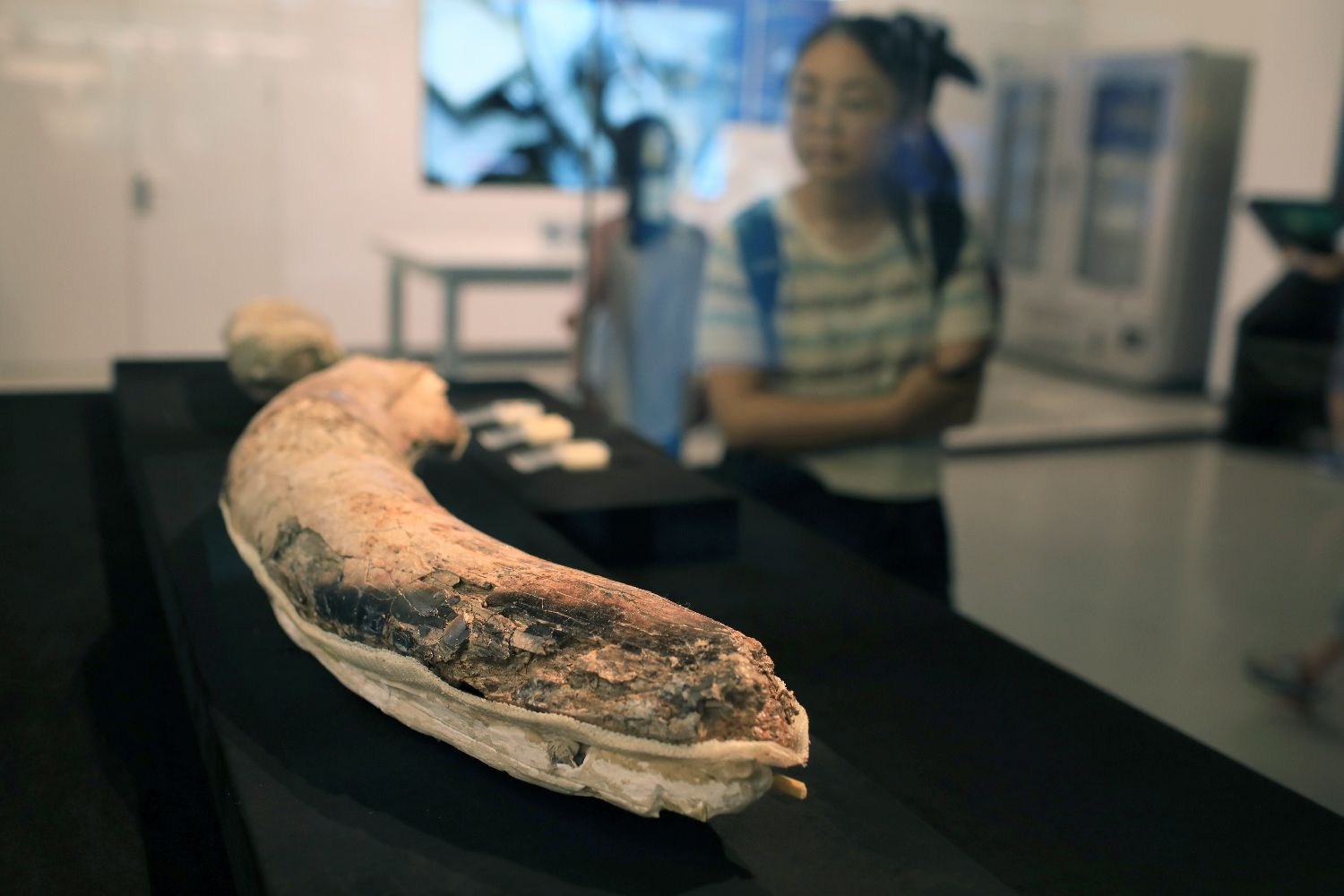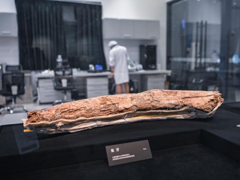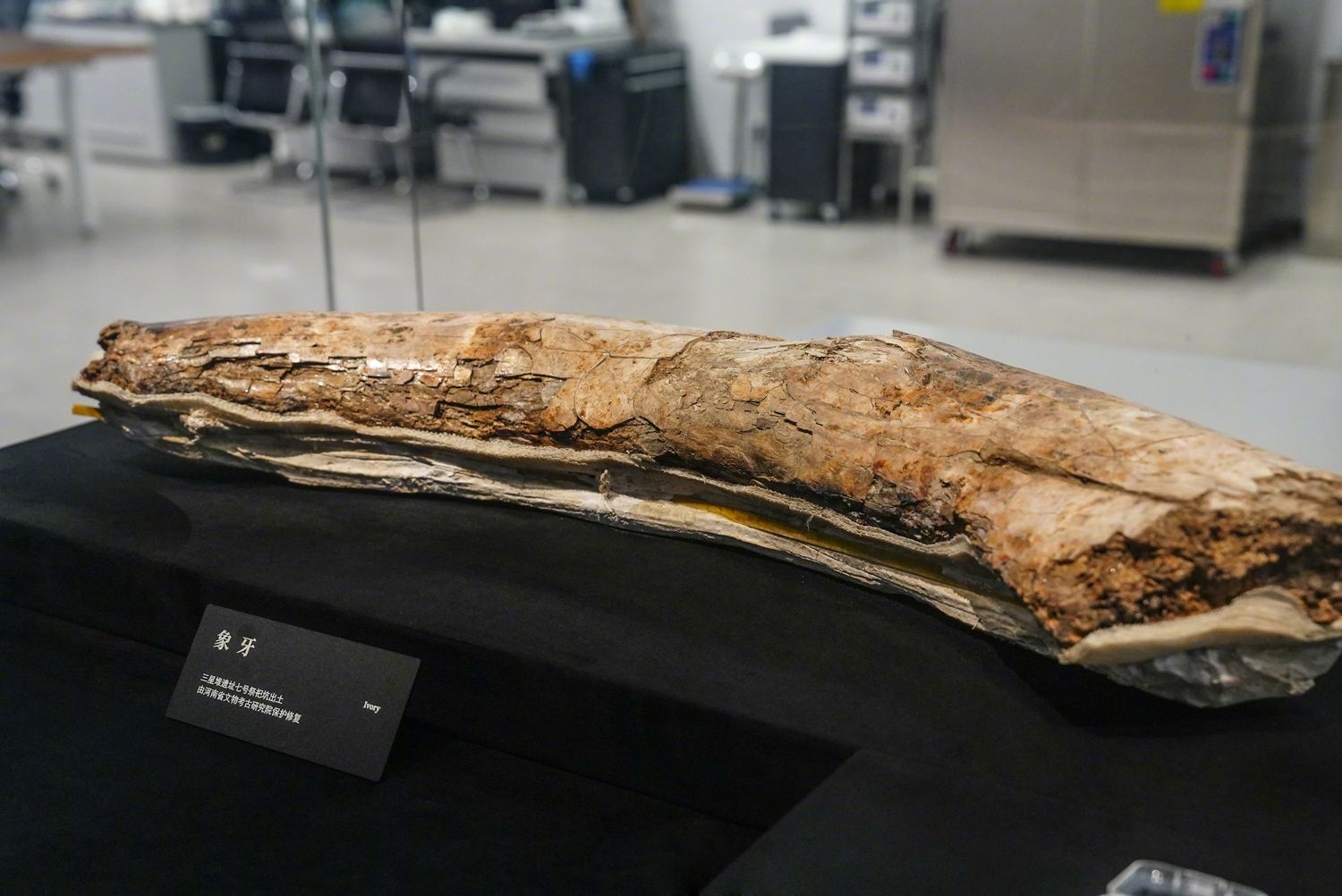 参观者22日在“匠心妙手——三星堆遗址新出土文物保护修复成果展示”试开放期观看展出的象牙。(图片来源:中新社)