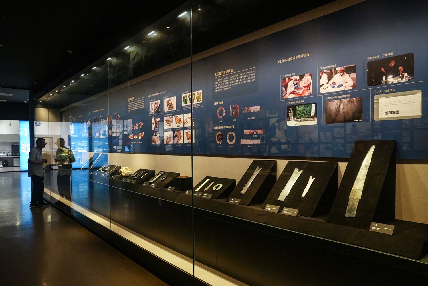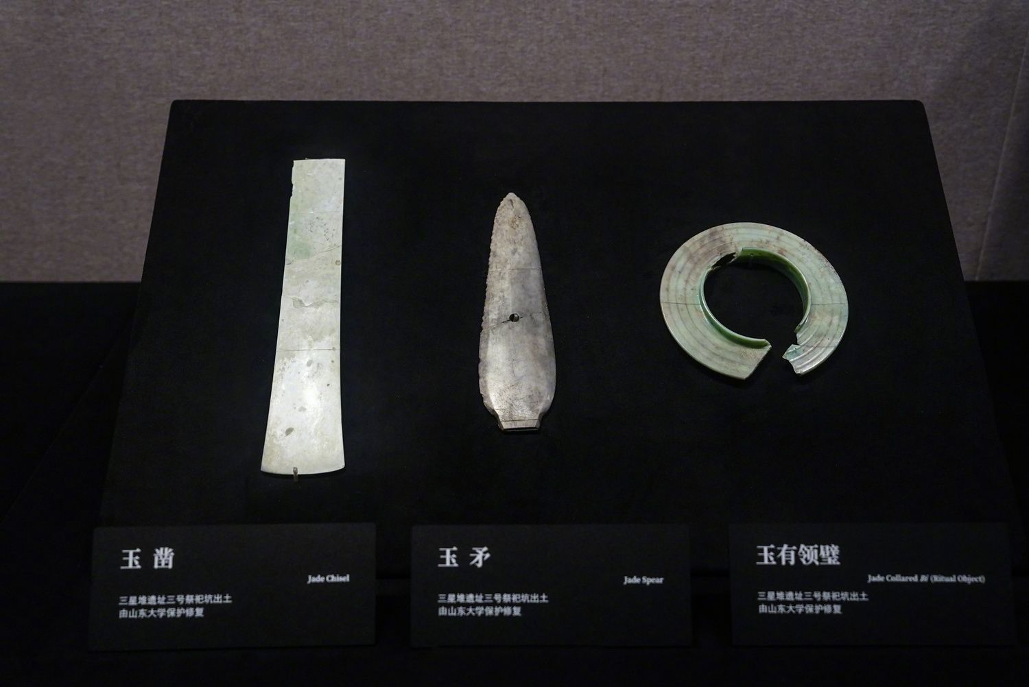 在三星堆博物馆文物保护与修复馆拍摄的玉凿、玉矛和玉有领璧。(图片来源:北京《光明日报》官方微博)