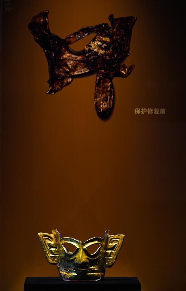 在三星堆博物馆文物保护与修复馆拍摄的修复后的金面具(7月23日摄)。(图片来源:新华社)