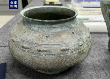 三星堆遗址3-8号祭祀坑出土编号文物1.7万余件,相对完整器物4500余件,文物存在残缺、锈蚀、断裂等不同病害。图为铜瓿。(图片来源:大陆央视新闻)