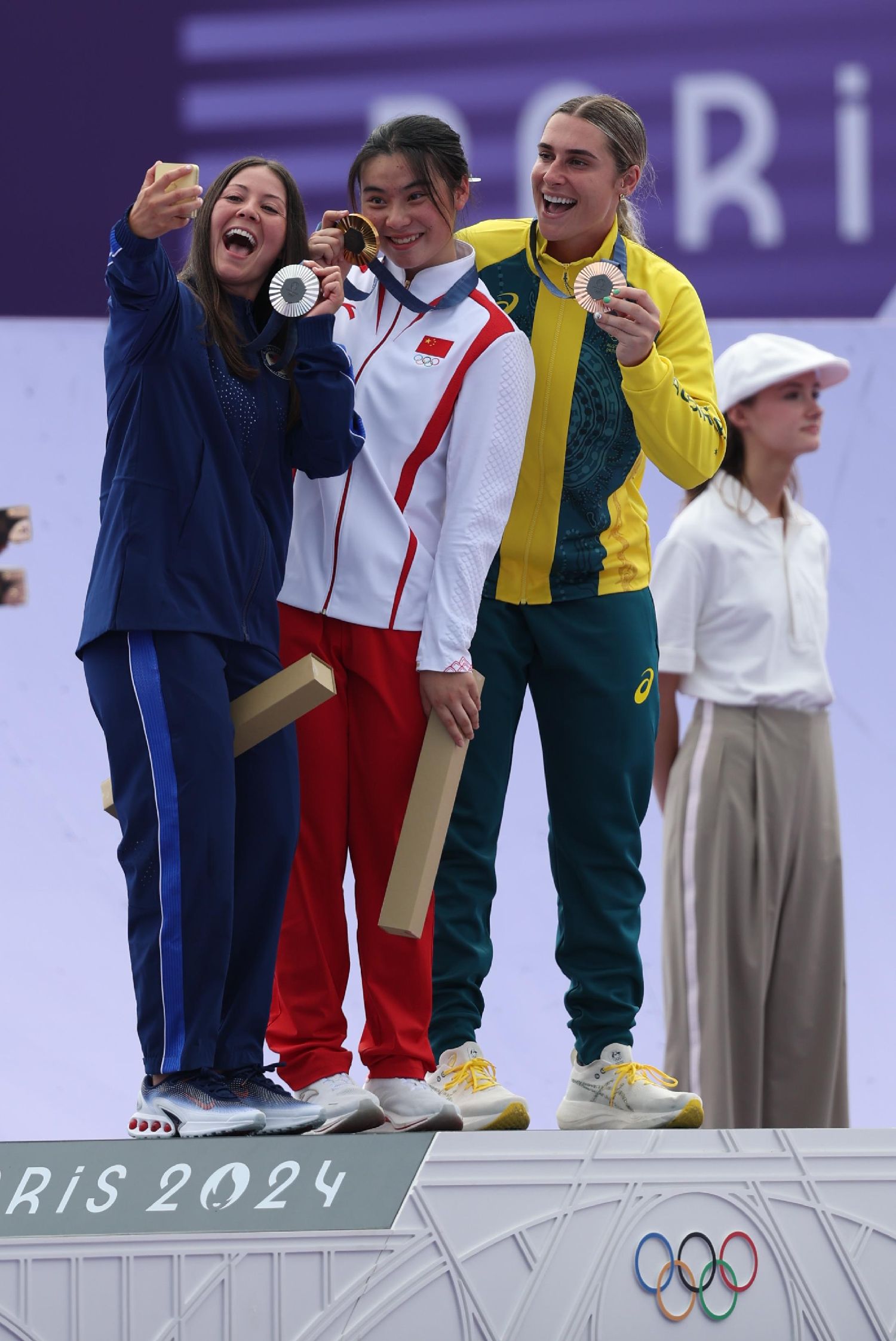 冠军中国选手邓雅文(中)、亚军美国选手贝内加斯(左)和季军澳大利亚选手纳塔利娅·迪姆在颁奖仪式上自拍留念。(图片来源:中新社)