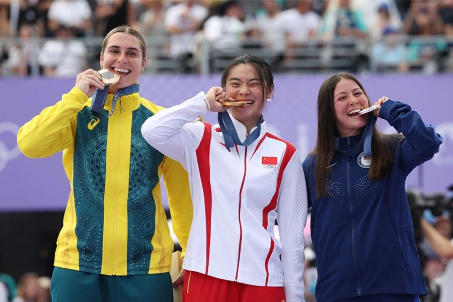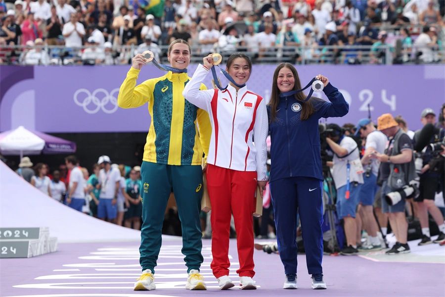 冠军中国选手邓雅文(中)、亚军美国选手贝内加斯(左)和季军澳大利亚选手纳塔利娅·迪姆在颁奖仪式上举着奖牌合影。(图片来源:中国日报)