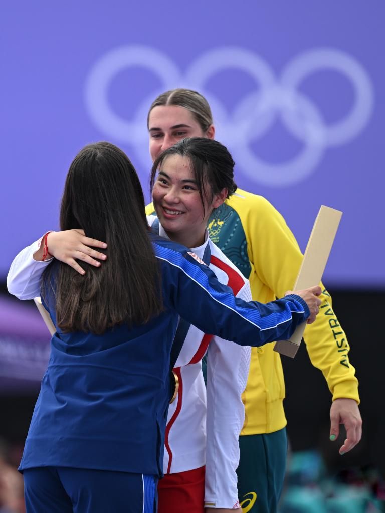 冠军中国选手邓雅文(前右)和亚军美国选手贝内加斯(前左)在颁奖仪式上拥抱(图片来源:新华社)