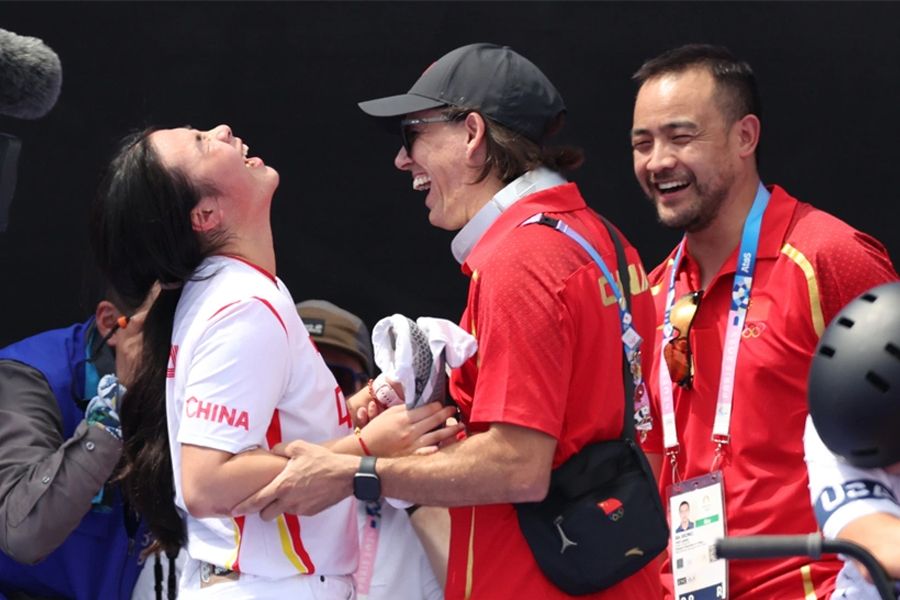中国选手邓雅文与教练庆祝胜利。(图片来源:中国日报)