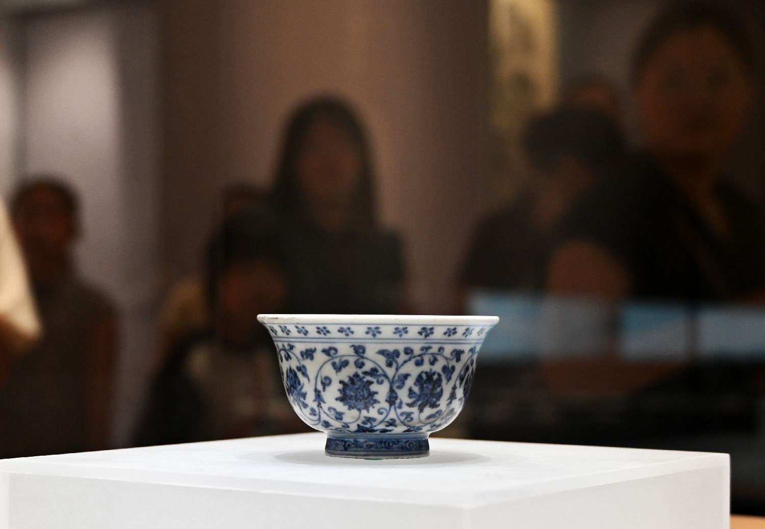 8月1日,民众参观青花缠枝莲纹压手杯。(图片来源:中新社)