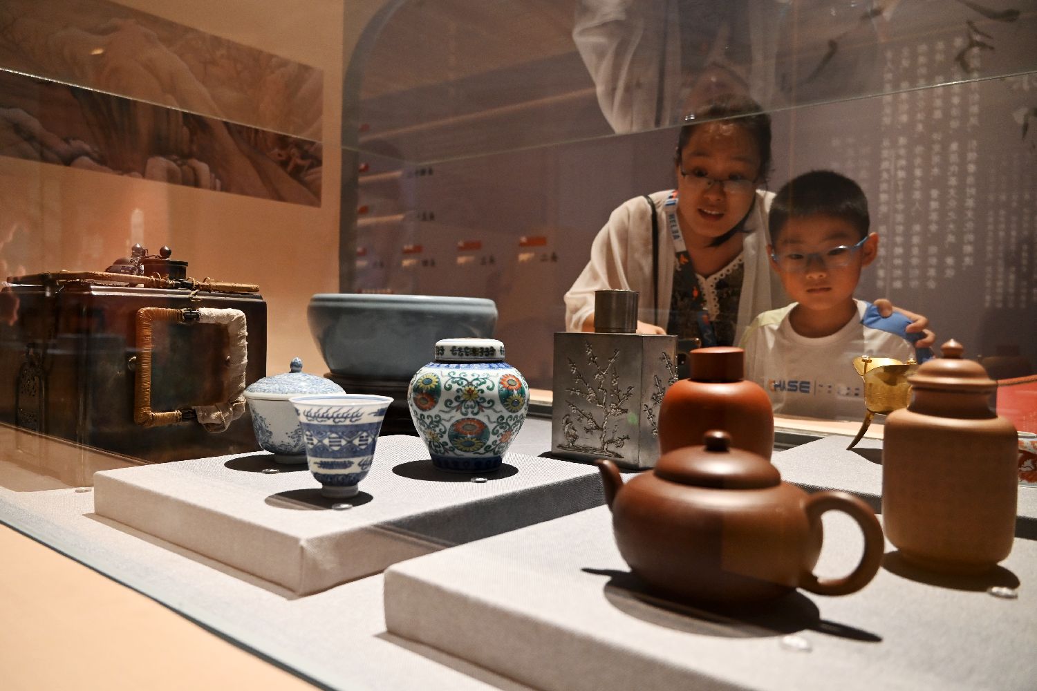 民众8月1日参观茶文化精品文物展。“故宫·茶世界:紫禁清韵——茶文化精品文物展”日前在位于石家庄的河北博物院开展,该展览由故宫博物院、河北博物院联合主办,是“故宫·茶世界”全球巡展的第二站。本次展览由“宫中佳茗”“乾隆与茶”“茶事源流”和“茶香燕赵”四个单元组成,汇集了故宫博物院、河北博物院、中国茶叶博物馆三馆珍藏的160件(套)文物与相关史料。