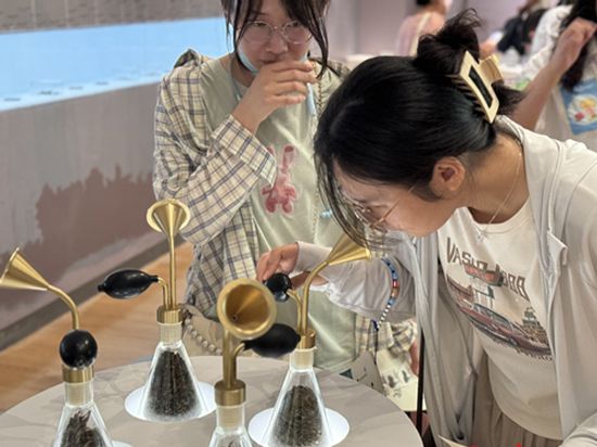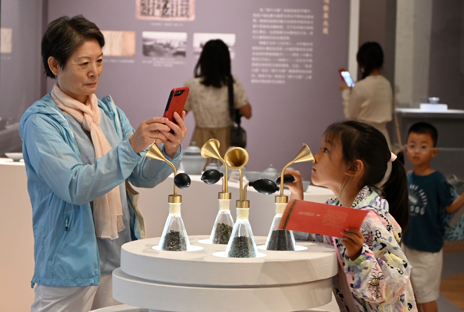 本次展览于7月26日—10月27日在河北博物院北区一层1/2号展厅展出,引领公众开启一片东方树叶联通中华上下数千年文脉的魅力之旅。图为游客在闻茶香。(图片来源:北京人民网)