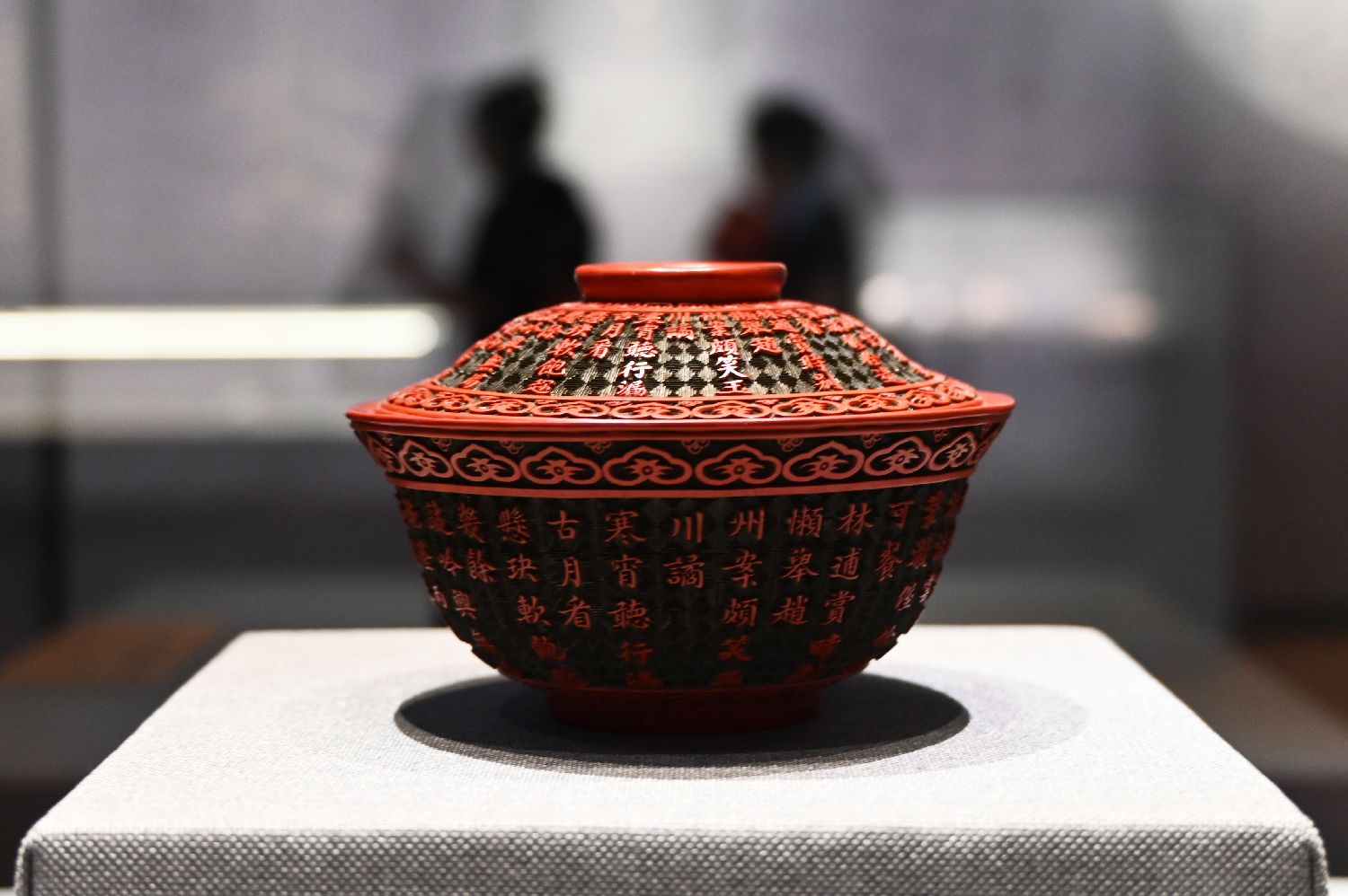 8月1日,展出的剔红乾隆御制三清茶诗盖碗。(图片来源:中新社)