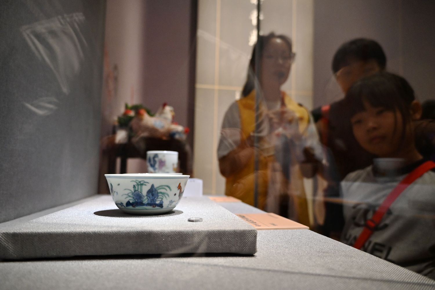 民众8月1日参观成化款斗彩鸡缸杯。(图片来源:中新社)