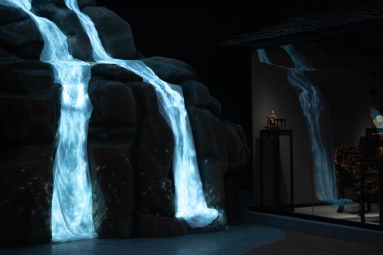 本次展览特别打造了艺术化瀑布景观,营造了《盘山千尺雪图卷》的沉浸式视觉氛围场景。图为《盘山千尺雪图卷》沉浸式视觉氛围场景。(图片来源:北京人民网\河北博物院供图)
