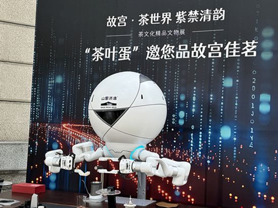 在“茶事源流”展区,食茶为用、煎茶浮珠、点茶成画、煮茶清饮、泡茶观叶,历代茶人茶事共同汇聚于此,唐越窑青釉八棱瓶、宋建窑黑釉兔毫盏、明永乐青花缠枝莲纹压手杯、明成化斗彩缠枝莲纹天字罐、清雍正成化款斗彩鸡缸杯、清乾隆粉地轧道粉彩缠枝莲方夔纹盖碗等精美文物悉数登场,公众能够近距离、全方位、多角度地感受瑰宝魅力。图为机器人制茶展示。(图片来源:北京人民网)