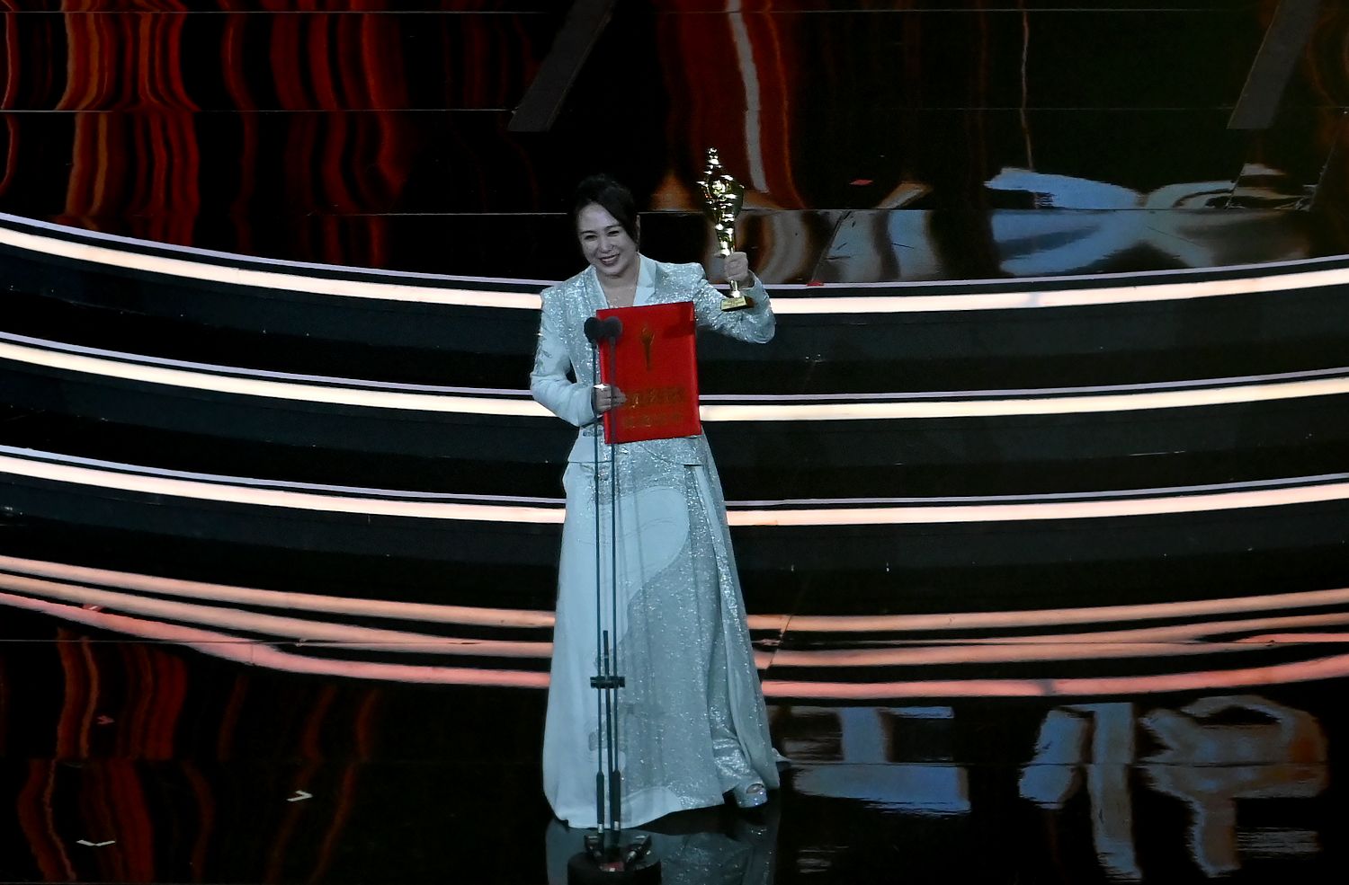 马丽凭借《第二十条》中饰演的李茂娟一角获得本届百花奖最佳女主角。图为马丽在颁奖典礼上。(图片来源:中新社)