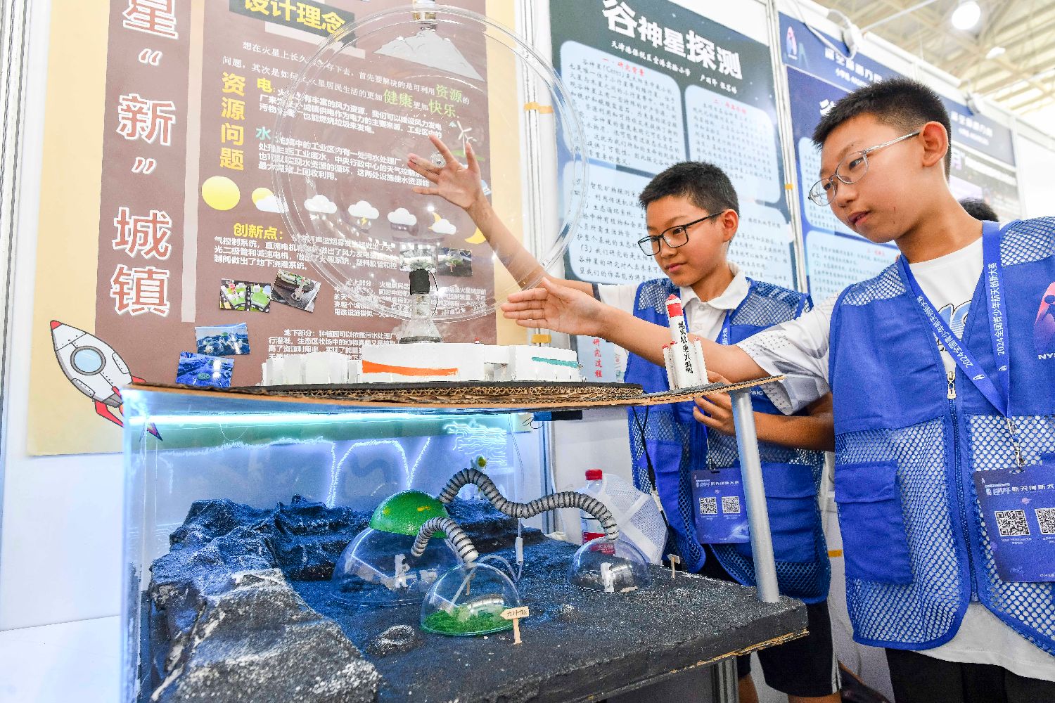 参加深空探测方向小学组的选手介绍他们的参赛作品《火星“新”城镇》。(图片来源:中新社)