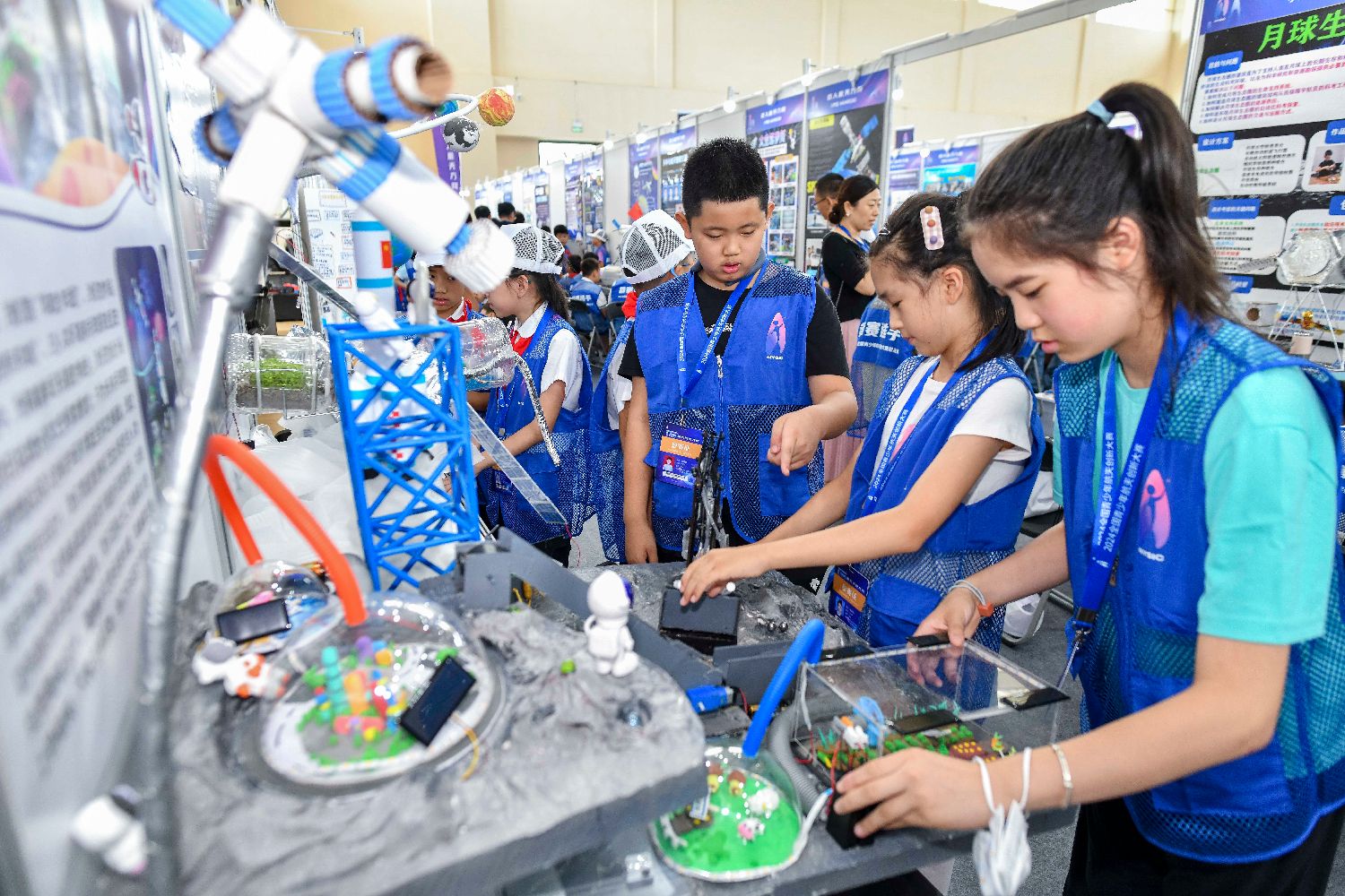参加载人航天方向小学组的选手在准备他们的参赛作品。(图片来源:中新社)