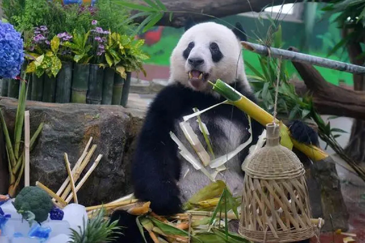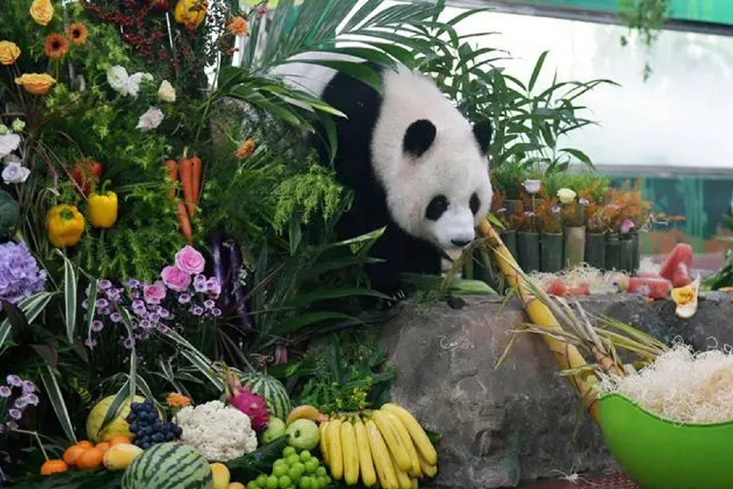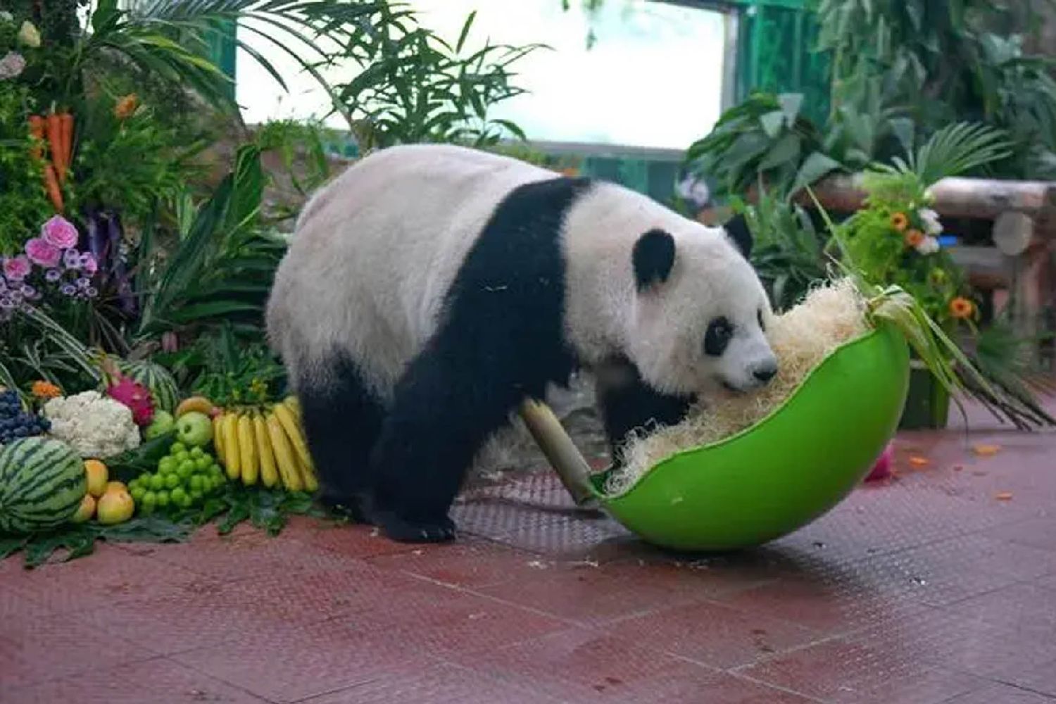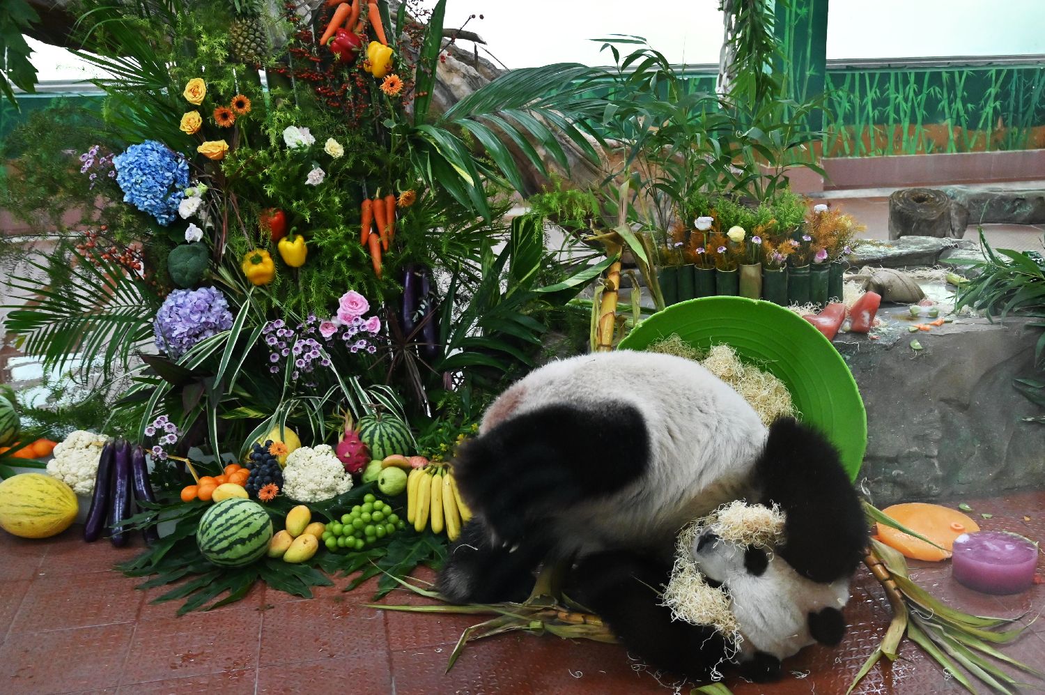 “雅一”则收到一面缤纷浪漫的水果花墙。由各色花卉和西瓜、苹果等多种蔬菜水果组成的生日花墙,寓意“五谷丰登”,场馆上方悬挂着画有“雅一”的竹筛,仪式感满满。图为8月27日,大熊猫“雅一”准备享用生日餐。(图片来源:中新社)